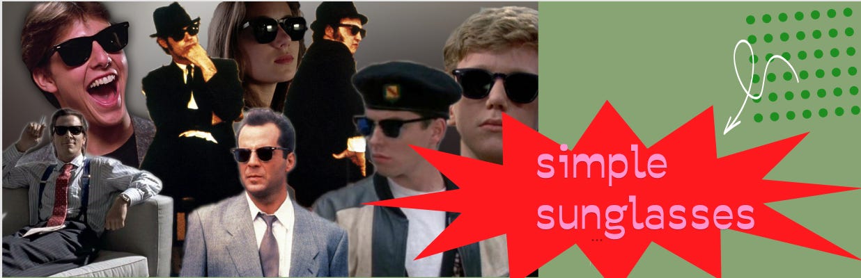 When it comes to sunglasses, The Shards is a world of wayfarers. It’s 1981: we’re five years off from Top Gun bringing aviators to the masses; and allegedly, Wayfarers have just entered the scene, thanks to Blues Brothers. This had me thinking: have we gone too far with trendy sunglasses? I’ve spent a LOT of money on trendy sunglasses that I either never wear or simply lose (a skill of mine): maybe the literal and metaphorical key to sunglasses staying power is taht simplicity is key.
